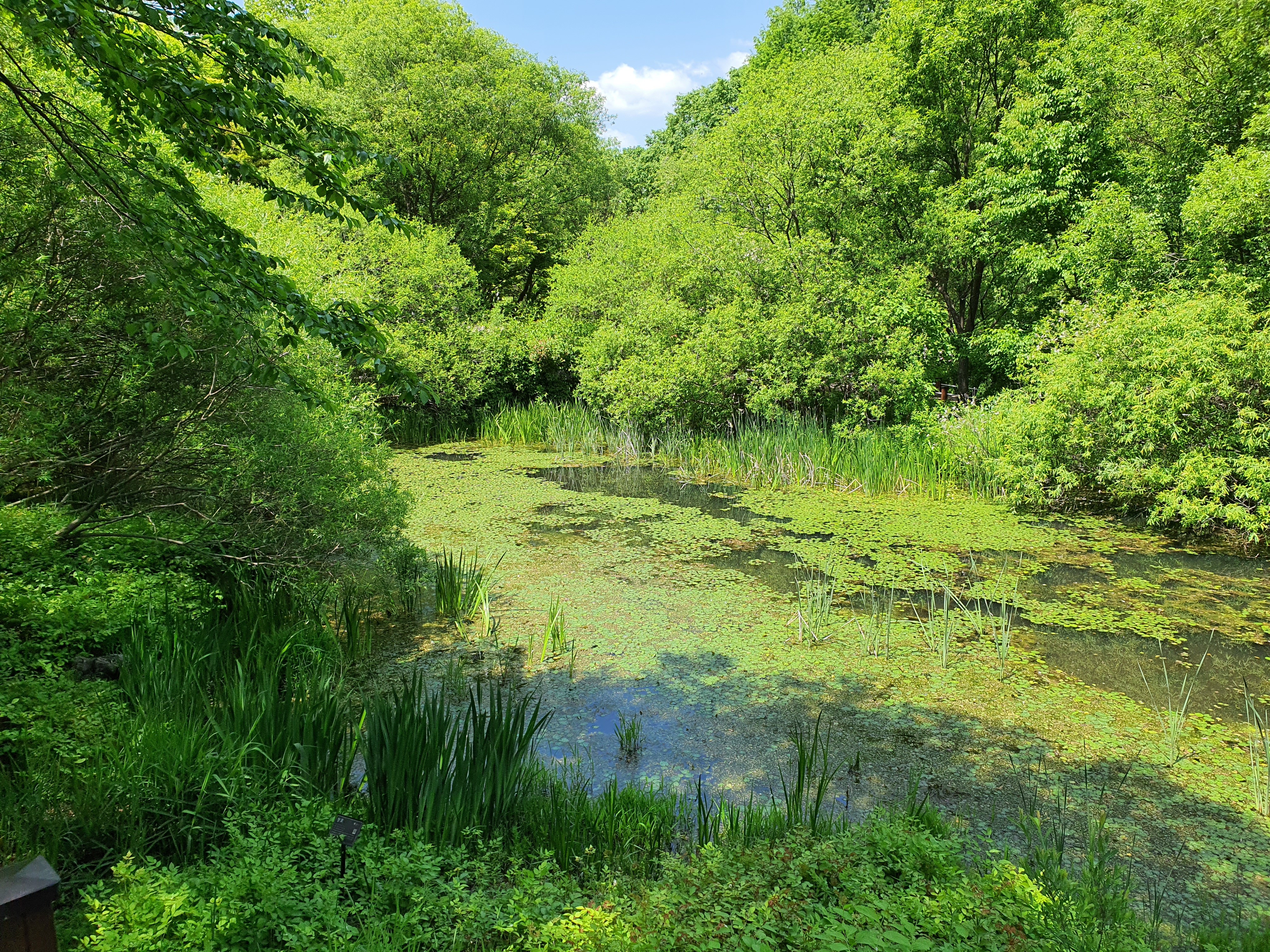 습지생태식물원의 습지들. 물위에 수생식물인 개구리밥이 둥둥 떠다니는 게 보인다.