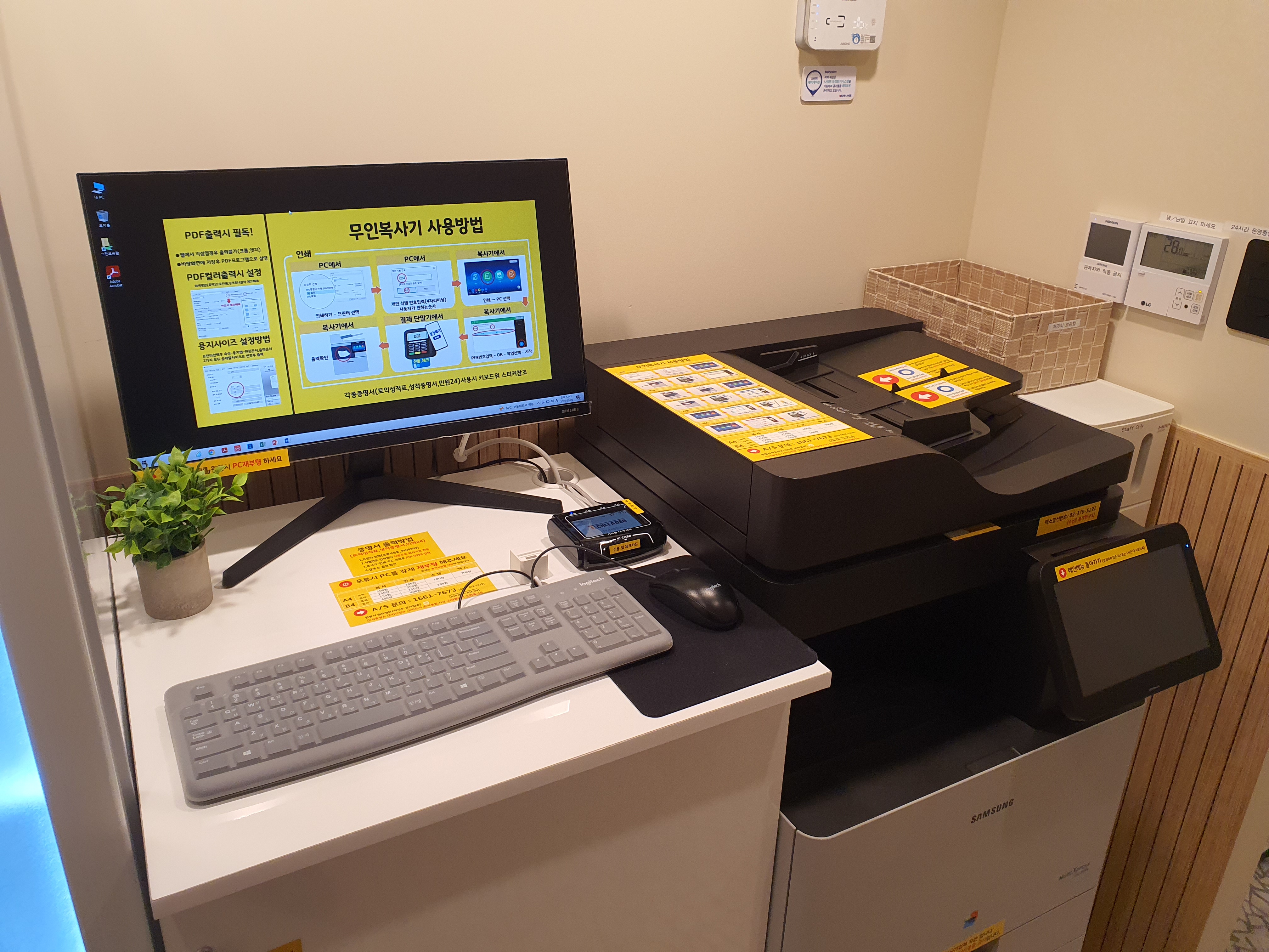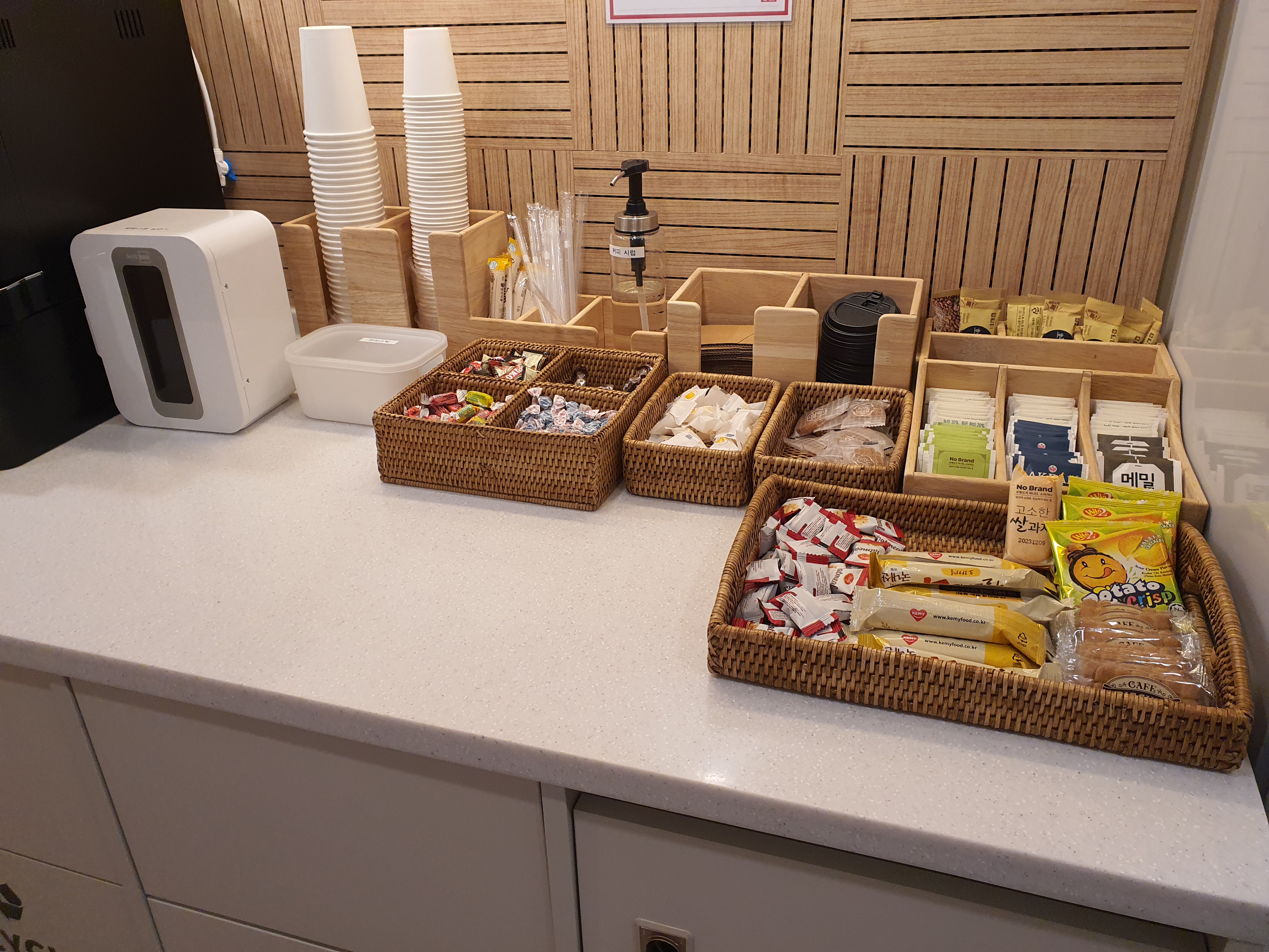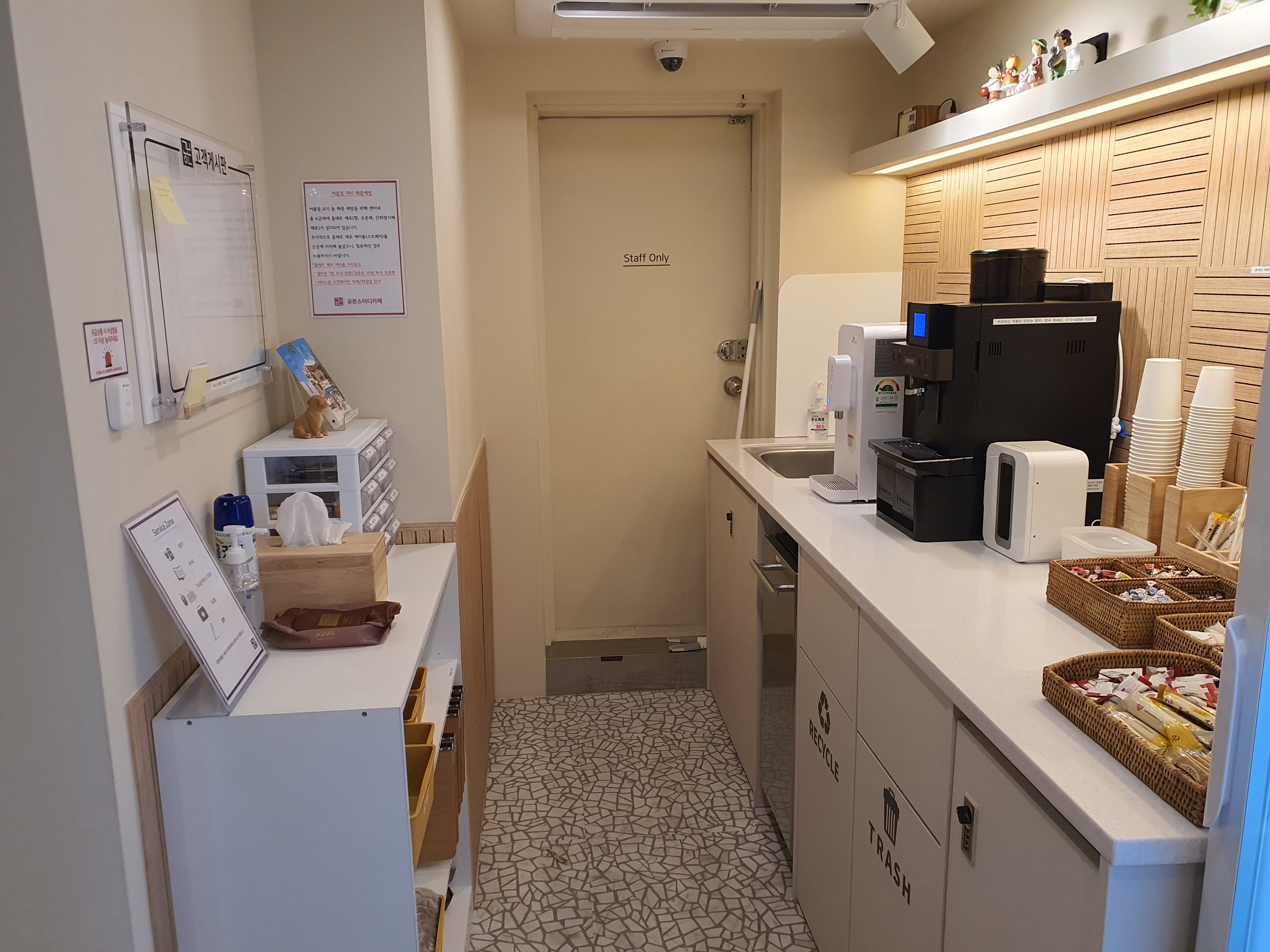 사진에 보이는 것은 스터디룸에 들어가기 전에 있는 휴게실이다. 정수기와 커피머신이 비치되어있고 간식도 구비되어있다. 그리고 복사기가 존재하여 복사도 할 수 있다. 왼쪽에 수납장에는 기본 필기구와 포스트잇도 비치되어있고, 마우스와 키보드도 구비되어있어 필요하면 빌려 쓸 수 있다. 와이파이도 당연히 기본으로 제공된다.